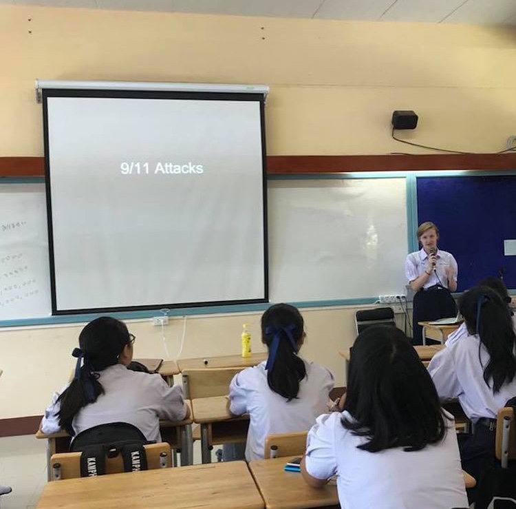 Teacher Suporn, my AFS coordinator and English teacher, allowed me to teach my Thai classmates about September 11th, 2001, a tragic day in American history.